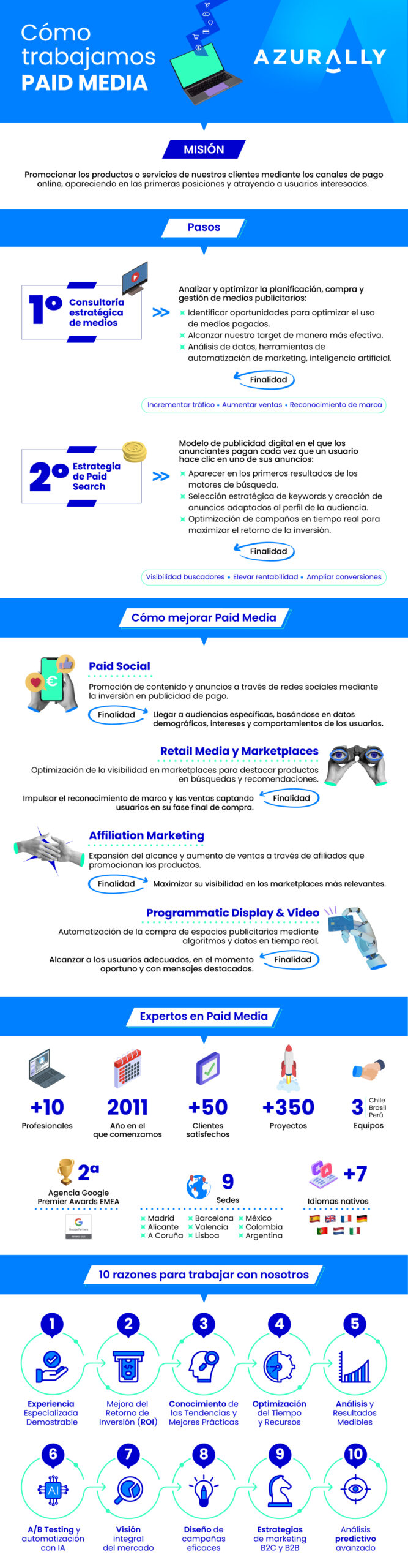 En Azurally destacamos por desarrollar y transformar estrategias digitales que integran la última tecnología en Paid Media con un enfoque estratégico que garantiza resultados sólidos y medibles. Nuestra experiencia en la creación de estrategias de marketing digital nos permite diseñar campañas que no solo generan un incremento de tráfico inmediato, sino que también aseguran que este tráfico sea cualificado para, así, aportar un incremento de ventas o leads en el negocio. En cada proyecto, nos aseguramos de que las campañas estén alineadas con los objetivos comerciales de nuestros clientes, permitiéndoles alcanzar nuevas metas de crecimiento.